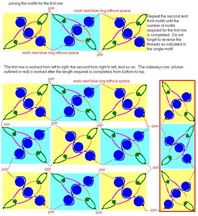 When you have completed the motifs you require, the edging is added, continuing without breaking the thread. The threads are reversed and the edging is worked over the motif just completed, so that the edging is worked along one side before the corner is made.