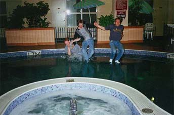 Archie Kenyon (left), Corey Porter (right) and I (center) jump into a hotel pool to celebrate the new year in 1996.