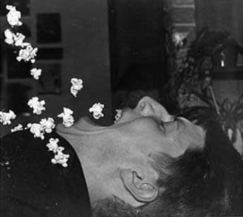 Here I practice the fine art of catching popcorn in my mouth as it spews out of the maker (which is sitting on my chest). My camera was set up on a tripod and I tripped the shutter at the appropriate moment with a plunger.