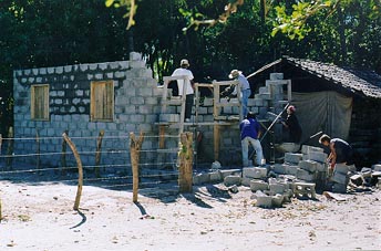 Filling in the blocks to build the front wall of the house.