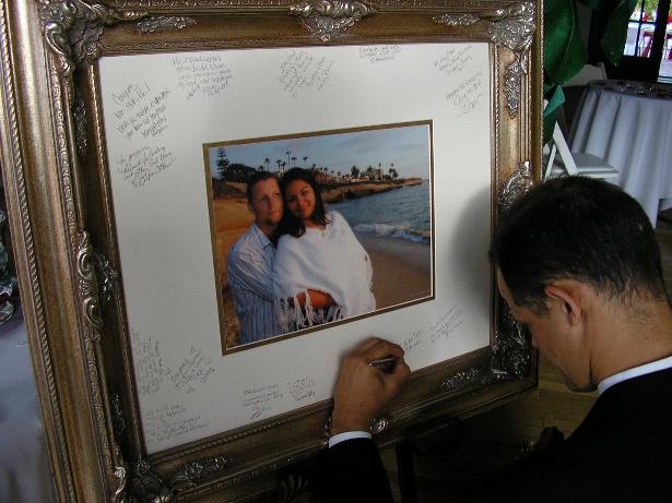 Geoffrey signs his wishes to the newly married couple on the portrait matte.