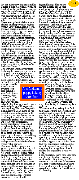 We constantly hear so much bad news about kids we tend to forget that all kids do not engage in bad behavior. We dwell on the fact that often kids today are cruel, cold, and unfeeling. We know that does not describe them all. Even tough kids, those street -wizened and hardened- by life ones, usually have a softer side. Sometimes, we don't see this side. There are two reasons for that. Number one is that when kids are busy getting into trouble, they keep us fairly busy also. We are dealing with the results of their bad behavior. We are involved in finding appropriate consequences and developing ideas to prevent a rerun of the situation in the future. We really are not looking for their good points. The second reason is that tough kids hate to let anyone know they've got a softer side. For them to appear caring or gentle, especially in front of their peers, is not something they want to reveal. To be soft or caring makes them appear and feel vulnerable. So, it is easier to be angry, rebellious, and tough. Recently, while doing an interview on a very unrelated subject, I was told a story. The folks I interviewed have a wild animal sanctuary, which will soon be opened to the public. Part of their advertising and educating the public involves taking baby lions, tigers, leopards, bears etc. to schools and nursing homes. It was during one of these sessions that a small miracle took place. It was an inner-city high school with lots of tough kids. The wildlife sanctuary staff was told to expect neither much response or orderly classroom. The kids may not pay attention or even acknowledge your presence, she was told. The teacher said that was their usual way. The lady was not worried; she saw the magic of these animals before. The class was in awe and amazement at how close they could get to these wild animals. They could touch them, pet them, hold them, and feed them. One very large young man weighing about 260 and towering over this little lady at 6' plus, took a liking to one of the cats. When she needed someone to hold that one during a demonstration, she handed it to him. He held it like a baby; stroking its fur, and hugging it close, gently whispering to it. She let it remain with him for the rest of the class. The class was over and the regular teacher looked at her with amazement. He had never seen the class so well behaved or so interested in any topic before. Then he looked at the very large young man, still clinging to the cat. "Unbelievable," he whispered, nobody can reach that kid. Finally, it was time to take the animals home. The lady went to put the |