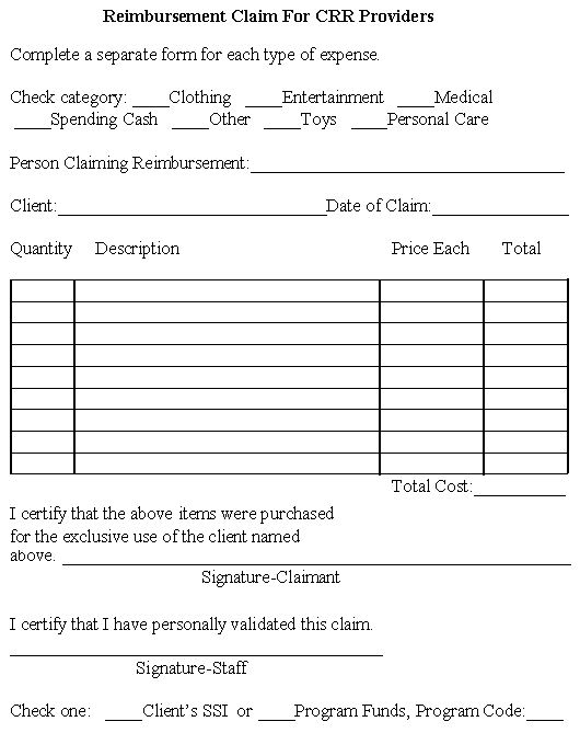 You fill out who made the purchase, for whom was it made, list of articles purchased, staple a receipt, and sign it. The funds must be used solely for the client. Reimbursement subject to availability of funds. |