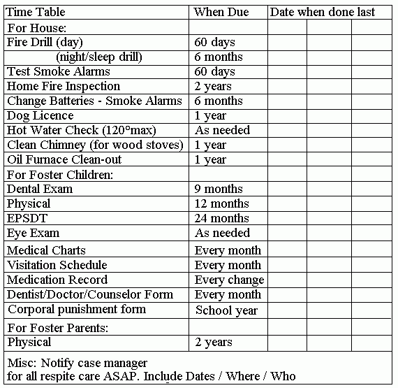 A form that has boxes to write in dates that you have done a required task. For example the fire drill, you would write in the date when it was done. This form includes the following: fire drill, test smoke alarms, fire inspection, smoke alarm battery check, dog license renewal, hot water check, well water test, chimney cleaning, dental exam, physical for child, epsdt, eye exam, medical charts, visitation schedules, Doctor appointment, no-corporal-punishment form, respite care and Parent physicals. |