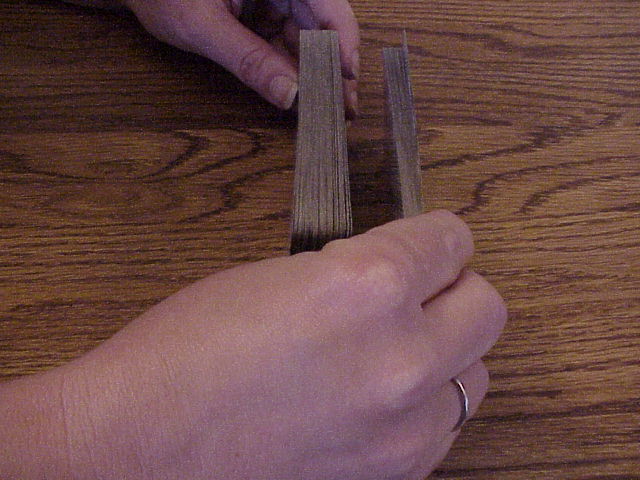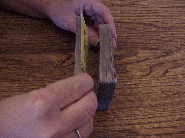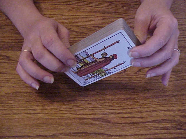 | Image 7 Image 8 Image 9 If the deck seems to be acting stubborn, such as if no cards are raising up while doing the draw, to me it is a sign to flip the deck over to the other side. Remember reversed cards can mean a total different thing. Some times I will shuffel the cards again as in Image 2 or 3 or cut them back to front as in Image 8 and 9. Perhaps the card the spirits want is at the front or back of the deck and cutting them in this way will change the order of the deck. If several cards keep coming up it means the person is dealing with alot of situations. The first card drawn represents the querent. They are thinking of too many different things as you are doing the reading.... Sometimes I will quote to the person... you are thinking of too many different things...there is alot going on in your life right now. Or they are dealing with alot of important issues and or decisions. Then I will ask the person to concentrate on the most important issue so the cards will give a more accurate reading Remember always use your intuition and words to guide or comfort the querent to help the reading. |