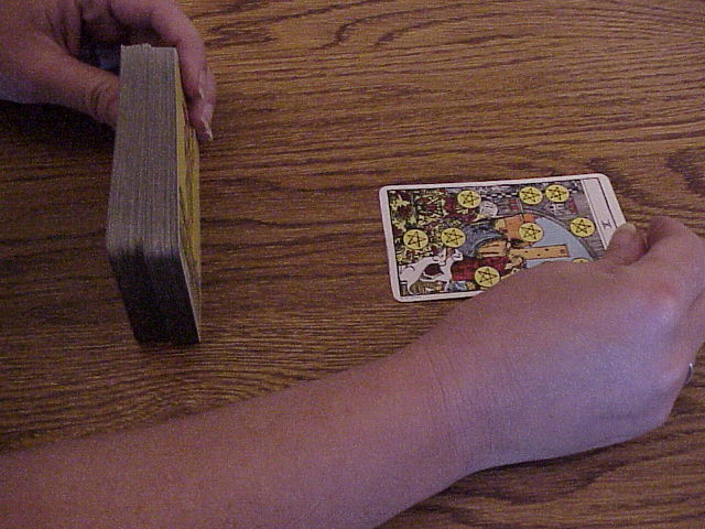 | Image 10 Image 11 Once the deck has presented you with a card draw it out of the deck and place it on the table.... ALWAYS position the top of the cards in the same way. If you put the left side of the deck as the top of the card always do it in that way. I draw out the card with my right hand and flip it over in the same way every time.... Consistancy in which is the top of the card is important so as not to confuse the spirits. Practice using the same hand motions in each and every reading. Always draw and lay the cards down consistantly in every reading. The tarot deck has several cards that can mean the same thing depending on if they are upright or reversed. With consistant placement the spirits will know which card to use to get the correct meaning. For example both the Wheel of Fortune and the 10 of Pentacles both mean sucess and rewards. But if the 10 of Pentacles is reversed it means the opposite ... it means loss or failure. The Wheel of Fortune reversed still means sucess and reward but in a lesser degree. CONSISTANCY IN CARD PLACEMENT TECHNIQUE IS VERY IMPORTANT |