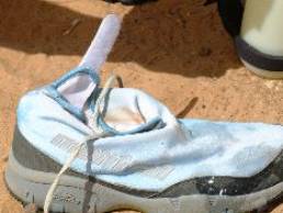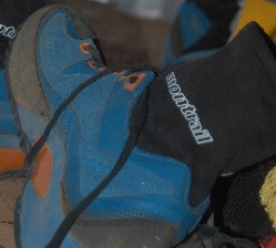 The custom Kinabalu: A standard Montrail Kinabalu trail racing shoe with a custom lightweight neoprene gaiter to keep the sand out of the top of the shoe. Pictured below, the shoe provided great support on the variable terrain and kept our feet virtually sand free.