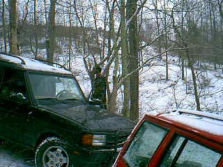 He finally managed to slide away from the innocent bystanders, but almost took out Trent's Jeep. |