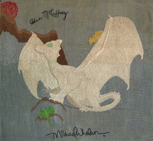 Welcome to my dragon page. I have always love to read about dragons and one of my favorite author is Anne MacCaffrey. She has a way of bring her people and dragons alive. I worked the dragon at the top on a shirt orginally, but the shirt finally wore out, so I cut it out and glued it to a piece of cardboard.