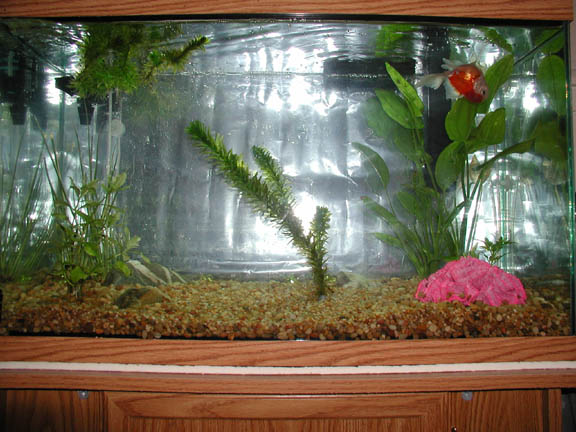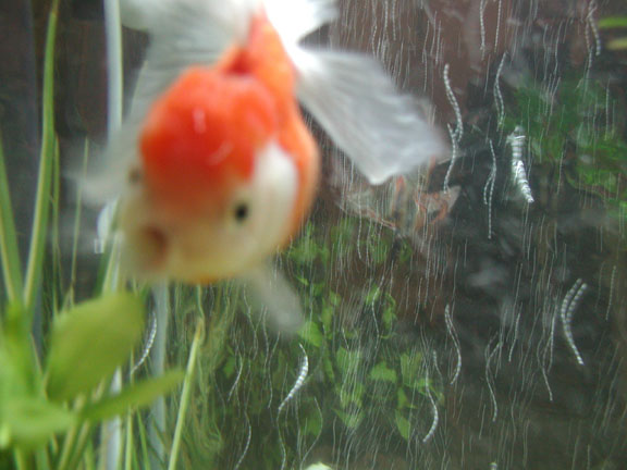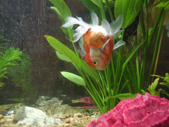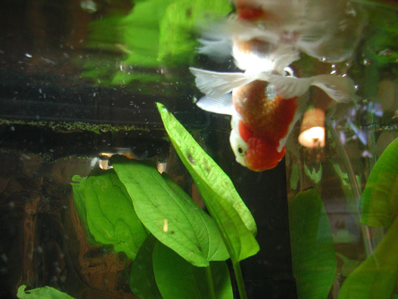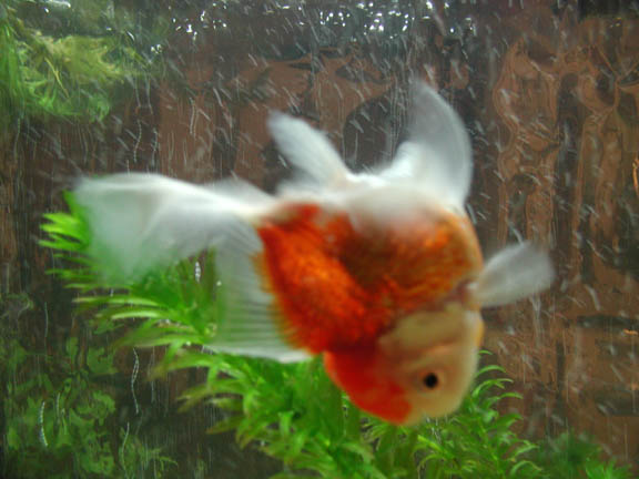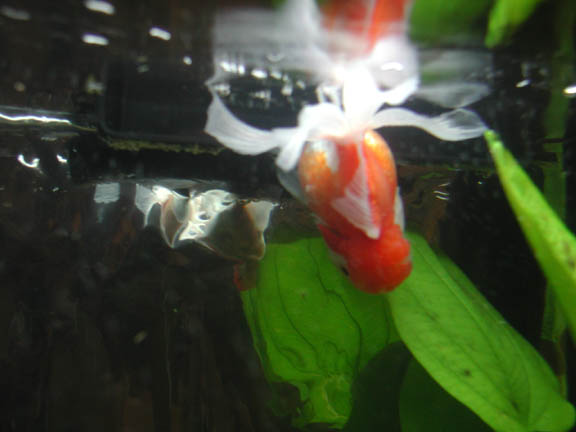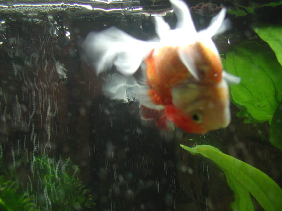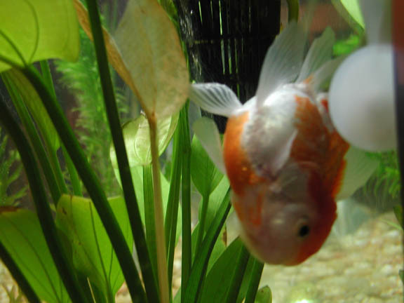 He was so pudgy and so cute, I knew he was the fish for me. I did some research to see what the nose diving was about, and found lots of possibilities. I fed him peas, and blood worms, and varied his diet. I isolated him, and snuck in medicated food for him.       I got very attached to him, and I believe Buddy did to me too. He will eat from my hand, since he has a hard time eating with the floating problem. He can't upright himself for floating food, and can't reach the bottom for sinking food, so I hand feed him.       Meanwhile, I had saved some money and set up a beautiful 29 gallon home for Buddy. I did a fishless cycle and waited impatiently. Finally, I was able to bring Buddy home. He was still nose diving, and it seems the floating has only gotten worse.       It makes me very sad to see him floating uncontrollably with his bum in the air above water. I continue to feed him foods that should work as laxative, but it's a temporary fix. After eating and pooping, he can right himself and swim normal for a few minutes, but after an hour or less, he is floating again.       I have decided something must be done. I am contacting vets to see if anyone is willing to take some air out of his swimbladder. It's a simple procedure, I just don't like needles. If this procedure doesn't work, I will send Buddy away for Flipover surgery.       I must take this opportunity to thank the wonderful people at the Goldfish Net. Through the advice on the posts, I was able to help Buddy and retain some hope. They have also educated me about the wonderful world of Goldfish, so that I can in turn educate my customers at the pet store, and spread the knowledge. Thank you, guys! |
