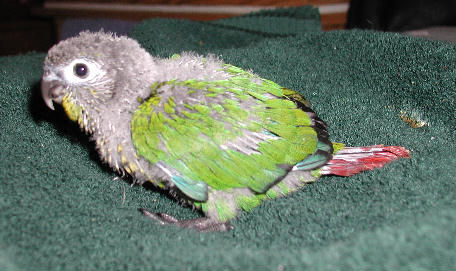 I finally got my baby green cheek conure. I don't know the sex yet, but I'm hoping it's a girl, I'd like to name her Cecilia. She was hatched around March 25, and stayed with the parents unil April 15. The breeder intended to hand feed, but I wanted to do it on my own. I took her home the 18th, and have been hand feeding her for 5 days now.