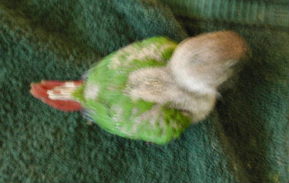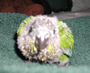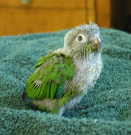 She started out as just a little chicken with no feathers. She's already got green all over, and big curious eyes, and the cutest little beak. She's got me resorting to baby talk! And she knows I'm her momma. She just figured out she can make noise, and has been chirpy whenever I'm within eyesight. She likes to wobble around inspecting the area, and even makes feeble attempts at perching. She sits spread eagle for balace, legs apart and wings open.       The older cats, Tiger and Prince, seem disinterested. But Patrick, he shows up at every feeding to lick the spoon. My trouble with him will be to keep him from eating the bird food, not the bird! Lucky only noticed him recently, since he's still a scaredy cat.       I'm still considering the baby cockatiel at work, he's my bud. He's totally relaxed with me, and seems very mild tempered, though talkative. I hate to leave him at that store. But I'm still trying to see if he's sick or just nervous, and trying to find opinions on housing the conure and cockatiel together. |