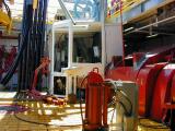 This is the drillfloor where the drilling is done. The white room is called the "doghouse" and is where the driller works. He controls all work on the drillfloor |