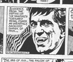| Unlike the vampire in the comic books, in the newspaper strip Barnabas actually looks a great deal like his TV portrayer, Jonathan Frid. Dozens of images of Barnabas from throughout the run of the strip are quite obviously bared on familiar publicity stills of Frid in his vampire makeup. |
