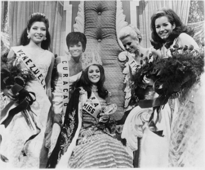 From the opening moments of the 1968 pageant the television viewer was aware of the contestant from Curaçao. Anne Marie was featured in the front row of the opening production number. And if one looked quickly, one might have thought that Diana Ross was competing for the crown! As the parade of nations unfolded, each delegate approached the microphone and said mechanically, in one language or another "Good evening, my name is...and I am from ..." But when Anne Marie, sporting a far-out version of the Sassoon haircut popularized by Diana Ross, came to the microphone, she greeted the world with "Hello everybody, I am Anne Marie Braafheid from Willemstad." Just different and warm enough to catch our attention and the judges. It was as if she was singing "Hey, Life, look at me!" from the Diana Ross and the Supremes hit from the year before, The Happening.