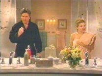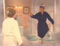 I tell you, these two are wonderful together, perfect timing. Dixie's cold, so Tad brings her her robe, which he notes is the one he bought for her all those years ago. :) Brownie points for Tad. Dixie asks him to turn around while she slips out of the towel she's wearing and Tad claims to be made of sterner stuff than she was. Tee hee. However, he takes a glass and watches her undress. When that doesn't afford a good enough view, he just turns around and watches!!!