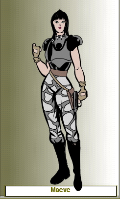 Animus in an approximation of her armour. Actually, it's a flak jacket and similar pants (think bulletproof vest material). But hey - close enough, ne? And yes. Her lips are white. Her wings are chrome-coloured.