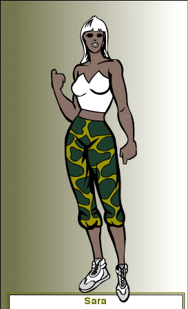 My best shot at drawing Jen in HeroMachine - she's wearing Ricochet's old clothes in this pic, which are of course a bit too big. This works for the pants; but HeroMachine for some reason can't comprehend a top that isn't skintight. Blah. Furthermore, her pants should be baggy, not falling down. Silly HeroMachine.