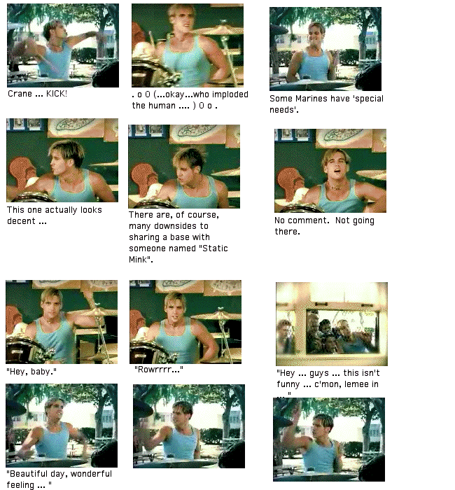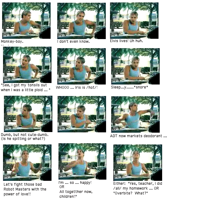 Anyway. ... these are some pics of Templar, my Mega Man MUSH char. Yay. ^_^ I got them from Eve6's "Tongue Tied" video (Tempie looks like their drummer, or vice versa ... sort of. Temp has black hair, for one...oh, forget it ^.-), and after I started grabbing pics, I realized how incredibly dumb most of them look. This guy looks cooler when he's moving, trust me. Anyway, I captioned two pages worth and showed them to my bestest roleplaying buddy ever, Ekanga/Isha the Wonderlizard/etc. etc. (aka Nightingale, Fury, Psyche), and then thought I'd post them here for you to gaze at in admiration.