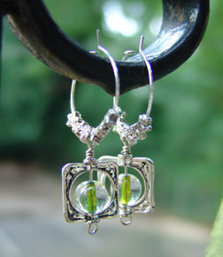 A perfect everyday earring featuring fun clear glass beads with green centers. Also inlcuded are silver tone star and frame charms, and aluminum findings.