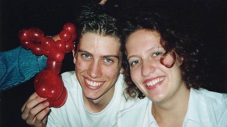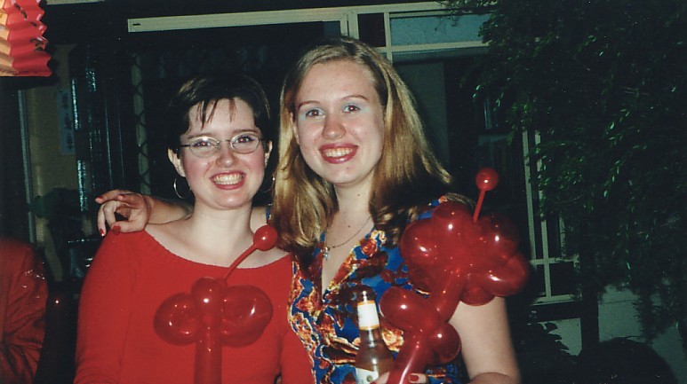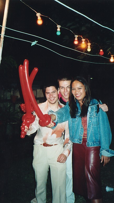 Description: Playing around with balloon swords at Liv's Retro 80's Party, any party with balloon swords ROCKS. LTR - Josh, Mitch & Alva