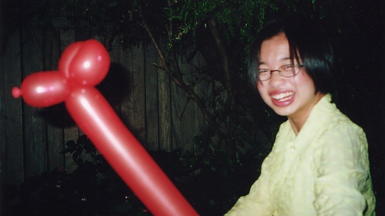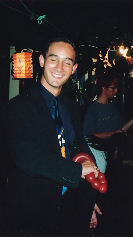 Description: Simon with his finger on the button, or, in this case, with his hand on the balloon sword.