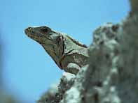 Un iguana mimetizzato tra le rocce dell'affollata spiaggia di Tulum. |