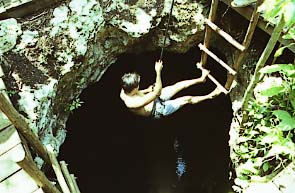 Un cenote nei pressi del villaggio maya di Pac-Chen. Un ragazzo scende con la fune; il pozzo ha un'acqua cristallina per via di un fiume sotterraneo. |