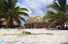 Una spiaggia bianchissima con le tipiche capanne e le palme.