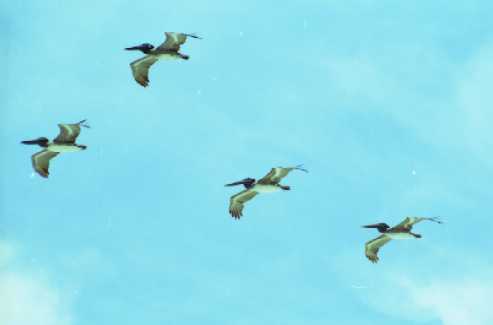 La penisola dello Yucatan è una grande pianura priva di fiumi; le coste sono lagunose, basse e ricche di palme; il territorio è calcareo, gessoso e poroso. I Maya vivevano attorno ai cenotes, doline, cioè grandi crateri di sfondamento tipici dei terreni carsici; ne furono affascinati a tal punto che venivano usati per rituali religiosi. Il territorio è un'immensa foresta tropicale, intricata e ricca di specie. Le coste sono piene di barriere coralline, le spiagge sono quelle tipiche caraibiche, con la sabbia talcata e bianchissima. Numerosa l'avifauna e gli animali che vivono nel territorio dello Yucatan. Nella riserva della Biosfera, tra le mangrovie, vivono i coccodrilli. Nelle foto dall'alto in basso, stormo di pellicani, mangrovie, una fregata in volo, il frutto della gomma, alberi tropicali, un delfino. |