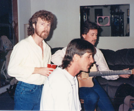 Terry on Diane Sayre's piano in early spring of 1989. David Hanshaw with guitar while David Comer looks on.