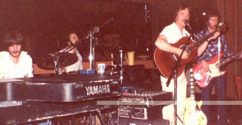 | The DDR band at Sunsrise Ski Lodge in the White Mnts. Az around 1980. LtoR Terry at the Yamaha, Steve Sayre(drums), David Hanshaw, David Comer. |