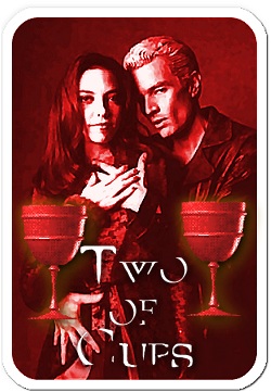 The Two of Cups: healing a severed relationship; forgiving and forgetting. Drusilla's fingers move, quicksilver, blood-red. She half-dreams as she lays out the arcana. Her lover shouts at someone, wicked Spike, still not strong, but he will be. He will be mended and together they will drink Slayerblood. Out of a china cup. The two of cups. Drusilla closes her eyes, seeing...seeing... * |