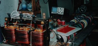 Harvey is trying to make a 3 phase tesla coil system. That is what teh alternators are for, They supply 3 phases of electricity. 3 phase electricity is usually not available for household consuption, as the electric companies only offer this to large consumers. So to experiment with this idea I have to make the 3 phase electricity myself. This will mean three tesla coils passing the top discharge between them in a triangular fashion, although much work remains to be done for a test try. He is planning on using a multilayerd winds for the secondaries, another untraditonal approach. These were the 30 coils on the garage table (pictured above), 10 of which will be used for each tesla coil secondary that produces the discharge. |