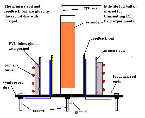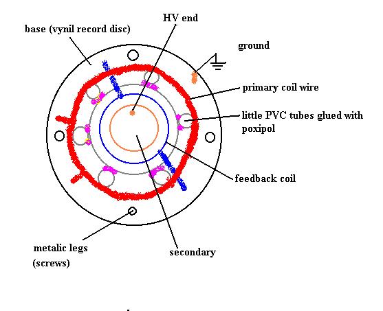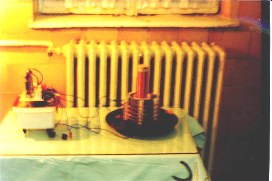 The driver: the white box contains the fillament transformer (220V/27V) and the multiplier. Above it is a little plastic plate which support the two PL500 tubes connected in parallel and the electronic components of the oscillator. The TC: the base is a vynil record disc with four metalic legs (screws). The outer coil is the primary with 5 turns of solid copper wire. I tune at 4 turns. The middle coil is the feedback coil with 15 turns of insulated wire. The secondary has 4 cm diameter and 20 cm lenght, with no topload, 800 turns (resonance frequency = 1.31 MHz). When I light neons I use a little ball at the top HV end made by aluminium foil. Suppresing the spark formation, a lot of energy is radiated as RF field all around the secondary. |