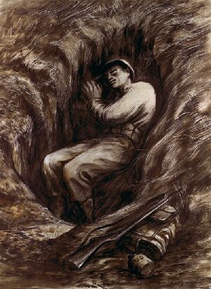 An American Soldier Sleeps The first rise in terrain off Omaha Beach was studded with foxholes, shell-holes and bomb craters left behind by troops that participated in the initial landings on D-Day. This soldier was typical of thousands who found what comfort and shelter they could after their landing on a hostile beach. Dreams of home, fatigue, and the realization of where he was and what he had been through marked his tired, sleeping face. |