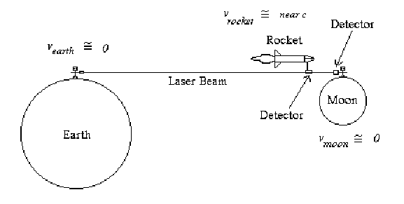 Two observers, one on the moon and one on a spaceship speeding away at near light-speed would measure the speed of a laser beam (light) to be the samespeed of the light being emitted from the laser to be its correct value, while the person in the spaceship will measure it to be half that value.