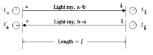 A ray of light moving between two clocks defines synchronicity of the clocks.Suppose that there are two clocks in space at points A and B, separated by some distance "l," which we shall call the length of the distance between them. Next, suppose that a ray of light leaves the first clock at time tA, which is the time read on a clock at point A. At time tB, the ray of light strikes a mirror located next to another clock at point B and is reflected back towards point A. The ray of light then returns to point A at time tA', as read on the clock at point A2.