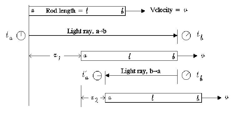 Suppose that there is a rod of length "l" as measured in the stationary (non-moving) reference frame. Next, a linear (straight-line non-accelerating) motion is imparted to this rod with a velocity, "v." For this experiment, there will be two observers: one stationary and one moving with the rod. There are three clocks, one on each end of the rod and one at the origin of the motion (which will be the origin of the measurement), which is stationary. All three clocks are said to be synchronized (according to the previous definition) in the non-moving reference frame.