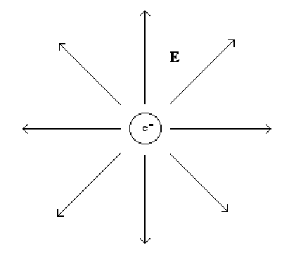 Electric field surrounding a charged particle, in this case, an electron.In this picture, I show a negatively-charged particle (an electron) and its electric field denoted by the symbol E which indicates that at any point in space throughout the entire universe (especially very near to the particle) its electric field will have both a magnitude (value) and a direction. This is known as a vector.
