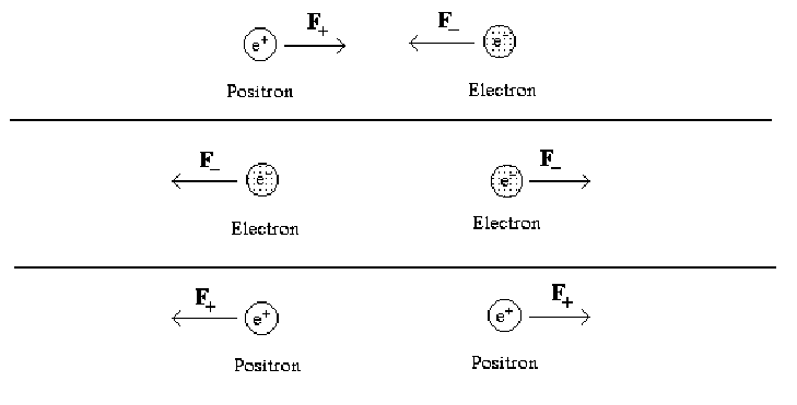 Electrons and positrons attract each other with a force. But two electrons or two positrons will repel each other with equal forces.A hundred years ago, physicists (like Hertz, Faraday and others) did a whole bunch of experiments on charged particles to figure all of this out and came up with this formula for the force (again we do not need to know or understand this formula-it is only here for those who are interested)