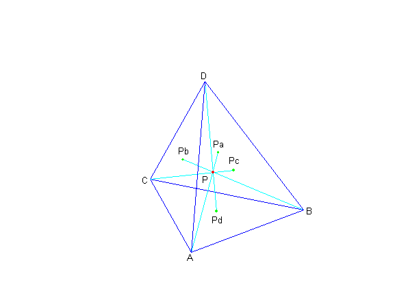 In Fig.1 is shown a tetrahedron ABCD and an arbitrary point P inside the tetrahedron. Points Pa, Pb, Pc, Pd are the intersection points of lines AP, BP, CP, DP with the tetrahedron faces DBC, CAD, BDA, ACB respectively.