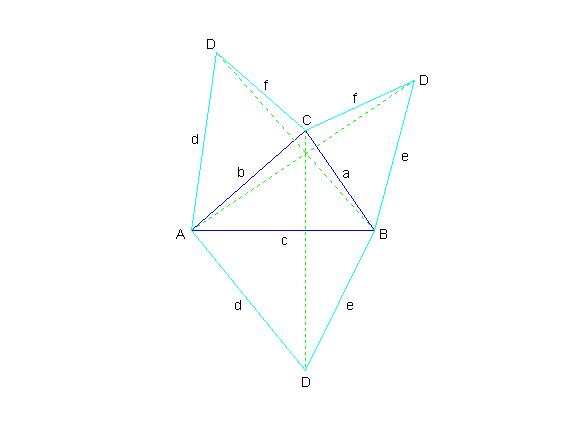 It is well-known that a tetrahedron has an orthocenter if the feet of its altitudes coincide with the orthocenters of the respective tetrahedron faces. If the lengths of the edges a, b, c are known, we want to determine the lengths of edges d, e, f such that the tetrahedron has an orthocenter. For this purpose we lay the faces DBC, CAD, and BDA on the plane of the face ACB as shown in Fig. 2.