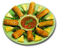| Heat a large skillet, add the oil, garlic, and pork, and saute' until the pork is cooked. Add the carrots, celery , sauces, sugar, and pepper. Cook for 1 minute on high heat to reduce the sauce and drain whatever liquid is left from the pan. Allow the filling to cool and then add the bean sprouts. Place a wrapper as a diamond with a corner towards you and place two tablespoons in the lower portion. Fold the corner up, rolling once. Bring the sides in and brush the upper portion of the wrapper with egg yolk. Roll the wrapper up, sealing the entire spring roll. Repeat with the rest of the wrappers. Heat the oil to 350 F (180 C) and deep-fry the spring rolls until golden brown. Serve with a sweet and sour sauce. |