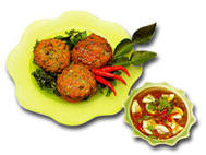 | Pound or grind together the shallots, garlic, lemon grass, coriander root, galanga root, krachai root, peppercorns, grated kaffir-lime rind, shredded dried chillies, salt, and shrimp paste to a fine paste. Put the minced fish in an electric blender, and blend in the curry mixture. Add the beaten egg. Pour the curried fish mixture into a large bowl. Mix in the chopped beans. Make flat, round fish cakes. Use about 1 spoonful of the fish mixture at a time. Heat the oil in a frying pan, and deep-fry the fish cakes until golden brown. Serve with cucumber dressing. | ||||||||||||||||||||||||||||||||