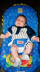 Joe is chillin, pretty happy. Ethan is trying to fint into Joe's bouncer.