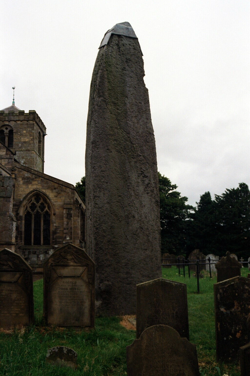 | The Rudston Monolith, at 26 feet high is the tallest standing stone in Britain and at least the same height is buried beneath ground. It stands in the graveyard of All Saints Church in Rudston Yorkshire and dates as far back as 2000 years BC. |