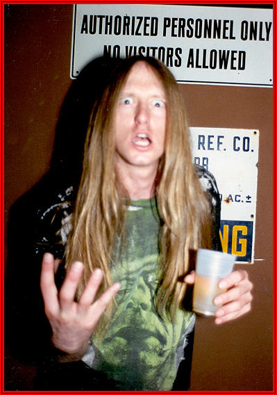 | This Mike Insuaste pic was taken before we performed for our album release party/concert at Tommy's in July 1988. We got really fucked up that night before we played. All of our friends and families were there. It was my proudest moment in my life at that point. Of course it had a typical bad ending for me... Both, Harden and I ended up in jail after the show was over. |