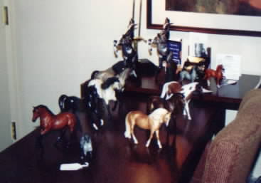 | OK so the pic is horribly grainy but this is most of our haul ... Got some Little Bits and some Classics and I picked up 2 Trads . Wound up with some cool pieces (these are off the "cash and carry" or "scratch and dent" or "grab and hog" table) ... I missed out on a Monte that was snapped up from right in front of me ... But wound up with the 1990 export red bay Ginger and the 1988 JCP SR black Classic Arab Stallion and Amanda got an original Jet Run ! I also wound up with a really light colored Just Justin ... Missing from this pic is the Quarterflash I got at a room sale . There weren't many room sales and all I found was Quarterflash but I was looking for him and I'm happy with what I got . |
