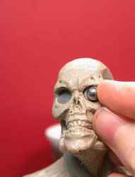 Esculpindo Olhos: Para os olhos de esculturas pequenas coloque contas de colar ou de bijouterias, ou do tamanho próximo do tamanho da sua referência. Se a sua escultura é grande pode-se usar esferas ou bolas maiores como as de ping-pong. Uma outra dica interessante é usar aqueles desodorantes "roller", você sabe, aquele que tem uma bola branca na ponta para aplicar o desodorante. Basta cortar o frasco e usar aquela bola, pois é ótima para olhos. Os olhos são muito importantes e sempre é aconselhável usar esferas e bolas do tamanho do desenho. Isto é muito importante quando o seu boneco será animatrônico e terá olhos que movimentam. Além de facilitar, porque é difícil esculpir esferas e bolas redondinhas. Veja abaixo o uso de contas de colar de bijouterias.
